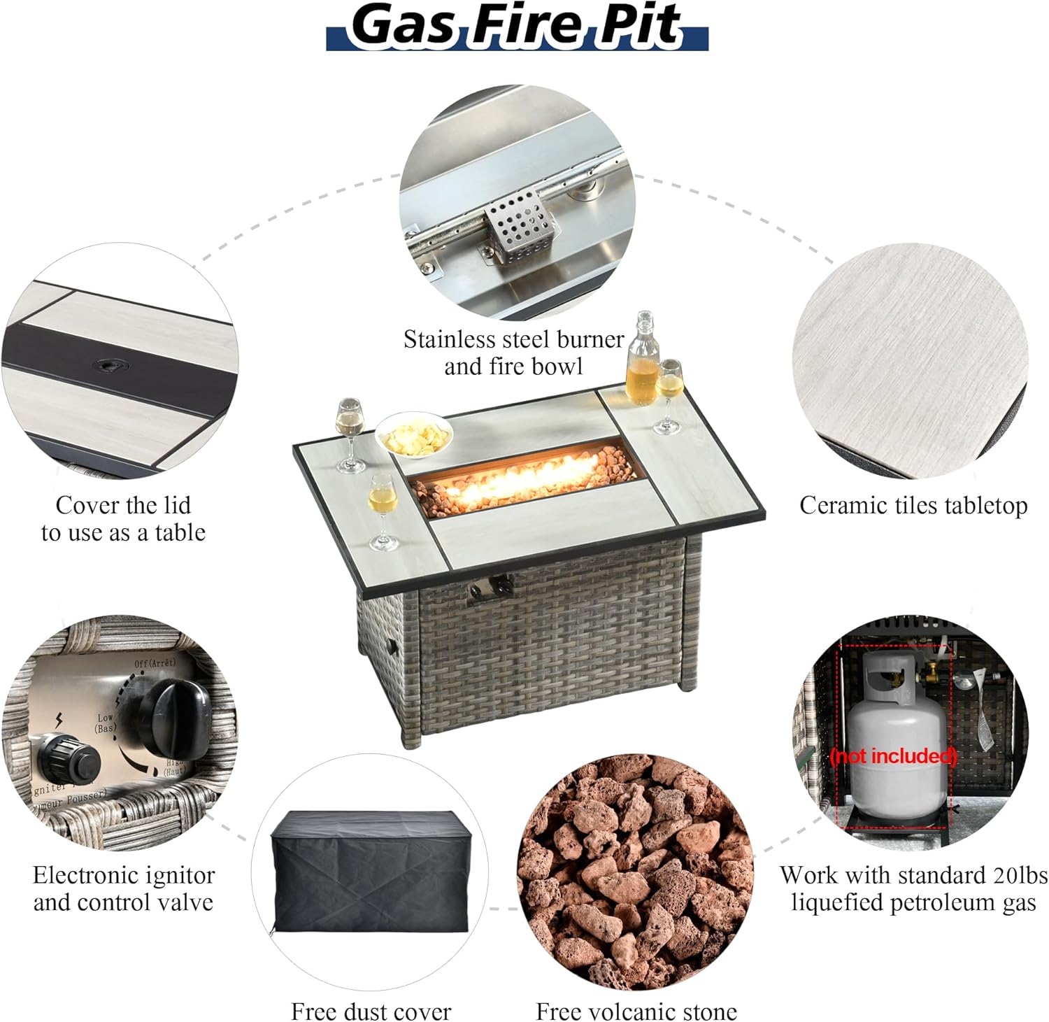 - FirePit Table Included: Comes with a square convertible propane gas fire pit table. Night time use it as a fire pit table to add atmosphere. Day time use it as a tall Dining table with the burner lid. Stainless Steel Burner withstands all weather. CSA certificated for safety.