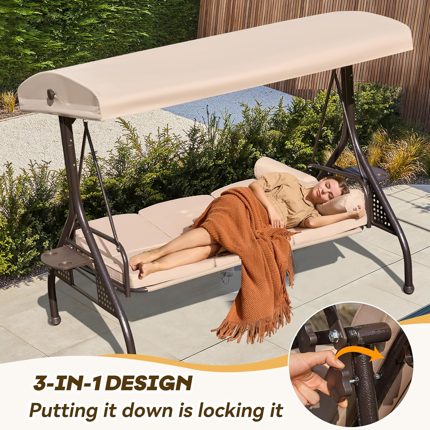 3 in 1 Outdoor Porch Swing with Adjustable Canopy, 3 Seat Outdoor Swing for Adults, Patio Swing Chair with Thickened Cushions,Pillows & Cup Holders for Backyard, Porch, Garden (Khaki)