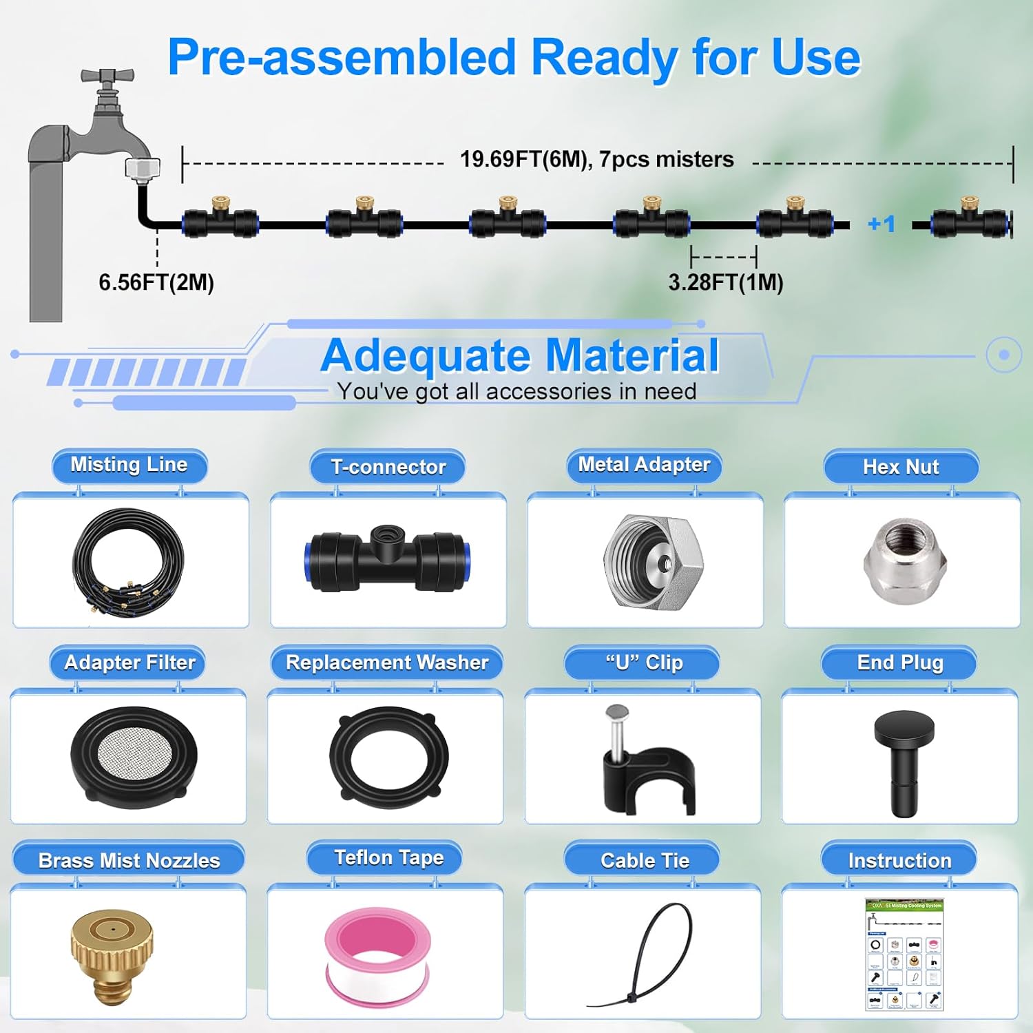- Upgrade Quality: The outdoor spray cooling system is equipped with a 3/4" universal solid brass adapter, flexible & sunlight-resistant PU tubes, an upgrade "I" shape adapter, and an exclusive brass misting nozzle with extra silicone gasket which is no leaking and have more smooth spray, good sealing tubing connector. All the accessories have good quality, good sealing, no blocking, no rusting, and longer service life.