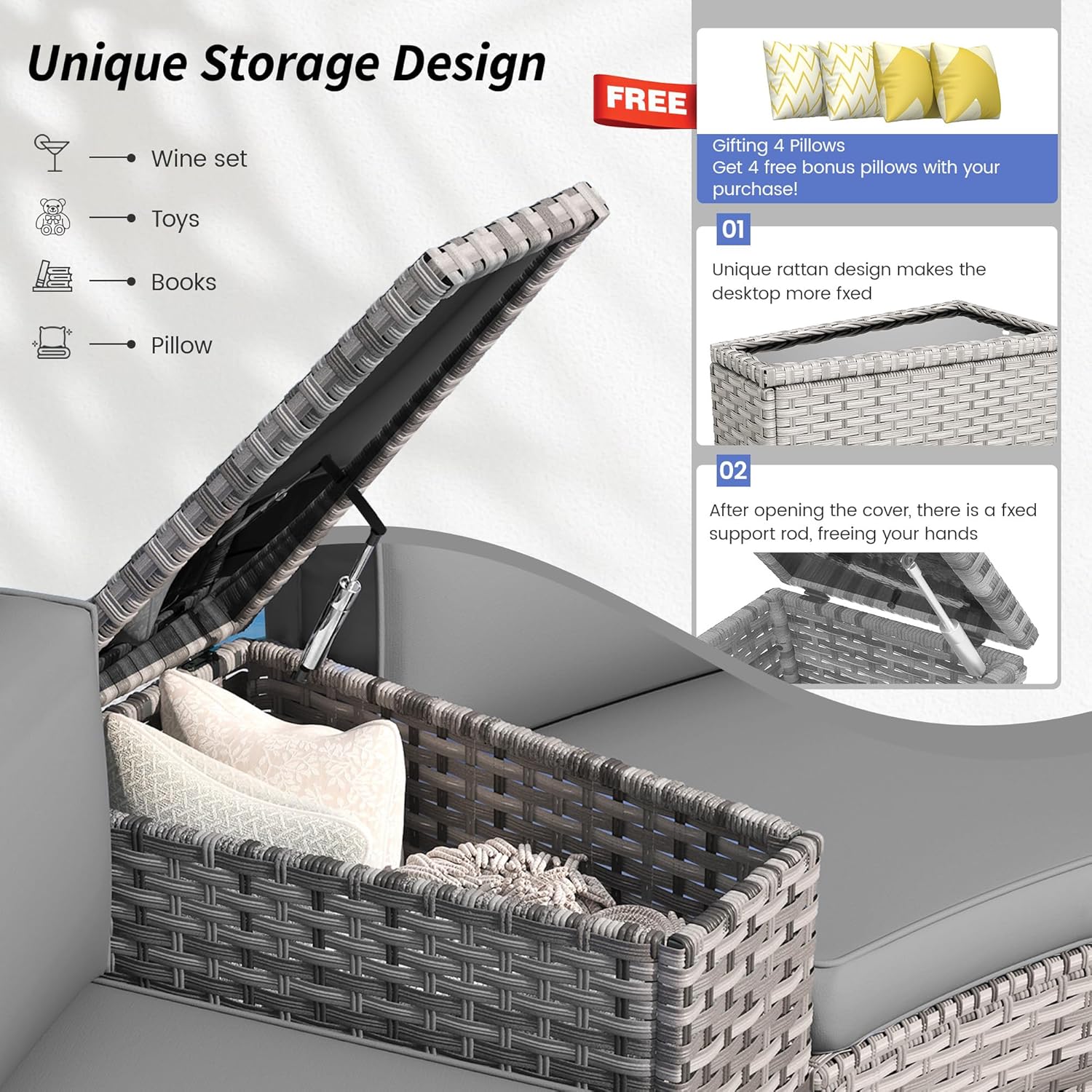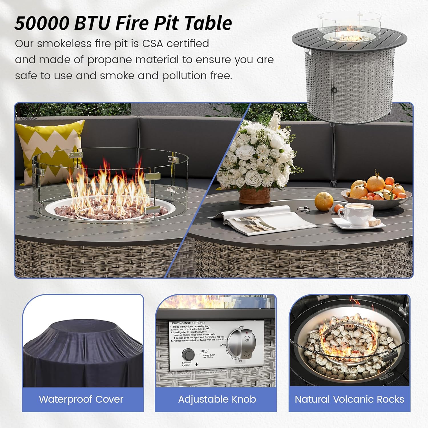 Patio Sectional Furniture Outdoor 12-Piece Grey Rattan Curved Sofa Set with Fire Pit Table,Storage Table,Pillows,Fit for Pool Backyard Balcony Porch Lawn (Grey)