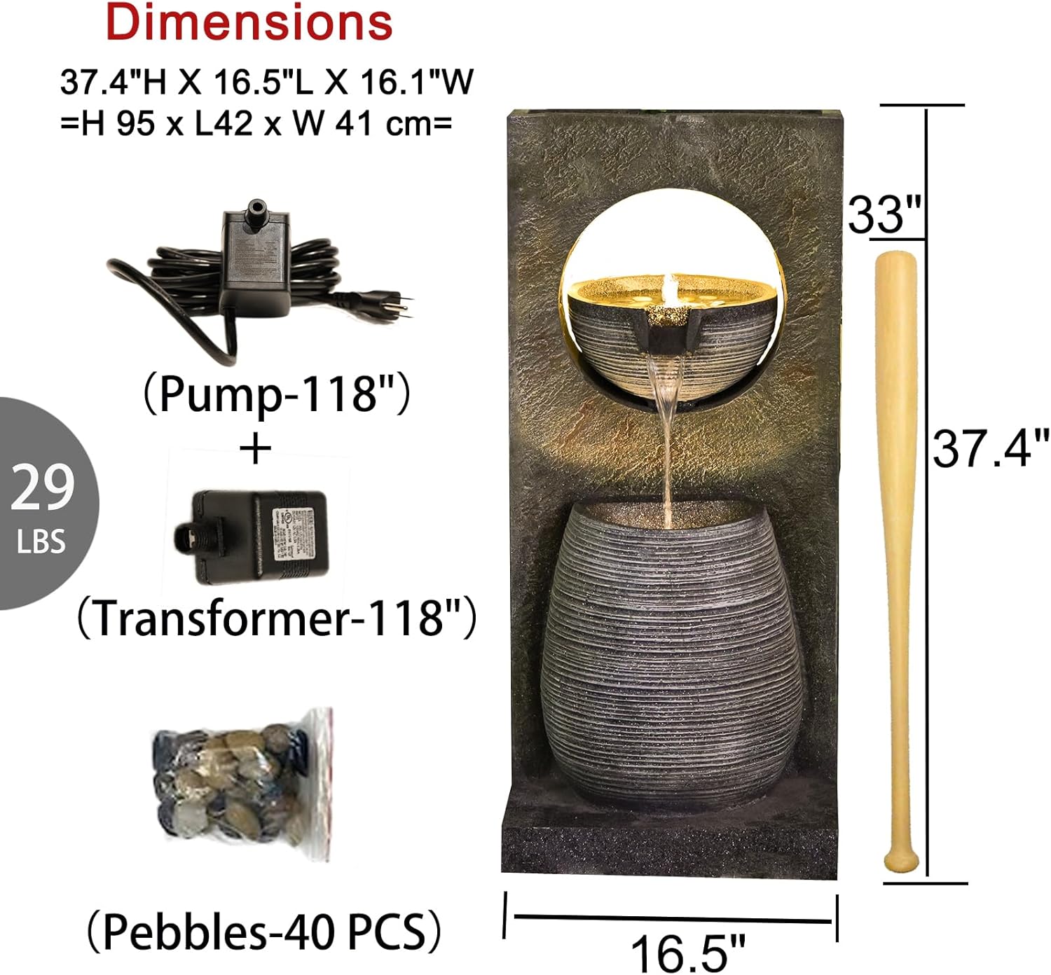 - SIZE & ACCESSORIES; The Patio fountain Is 16.5"L X 16.1"W X 37.4"H To Fit Outdoor Decor. Easy To Assembly Including Lights And Pump, Package Included - Garden Fountain(38lb)*1,Transformer With 6ft Power Cord*1,Pump*1,Instruction*1. Pebbles*1.