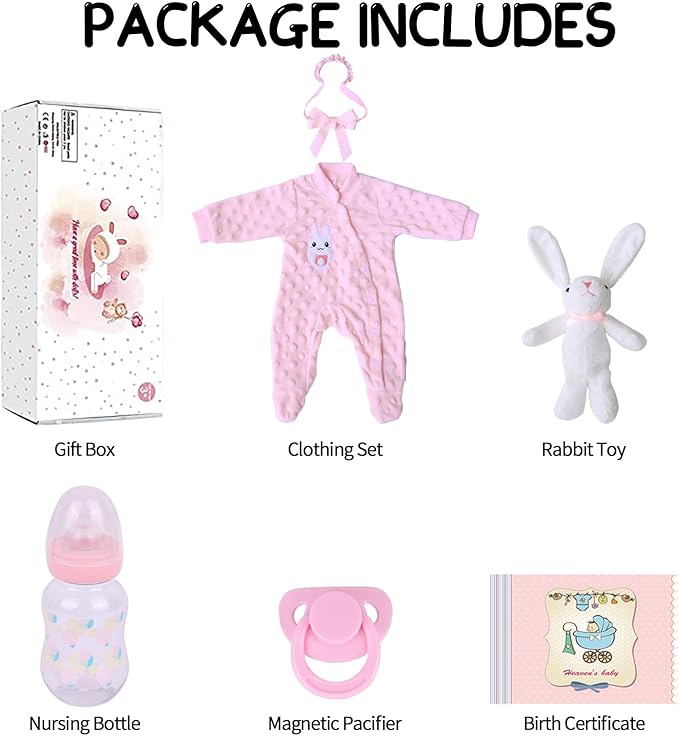 - Luxury Gift Box: Welcome your new baby Lucy! In addition, now the set includes 1 set of pink clothing, 1 rabbit doll, 1 magnetic pacifier, 1 feeding bottle, 1 birth certificate and 1 gift box, all in one package