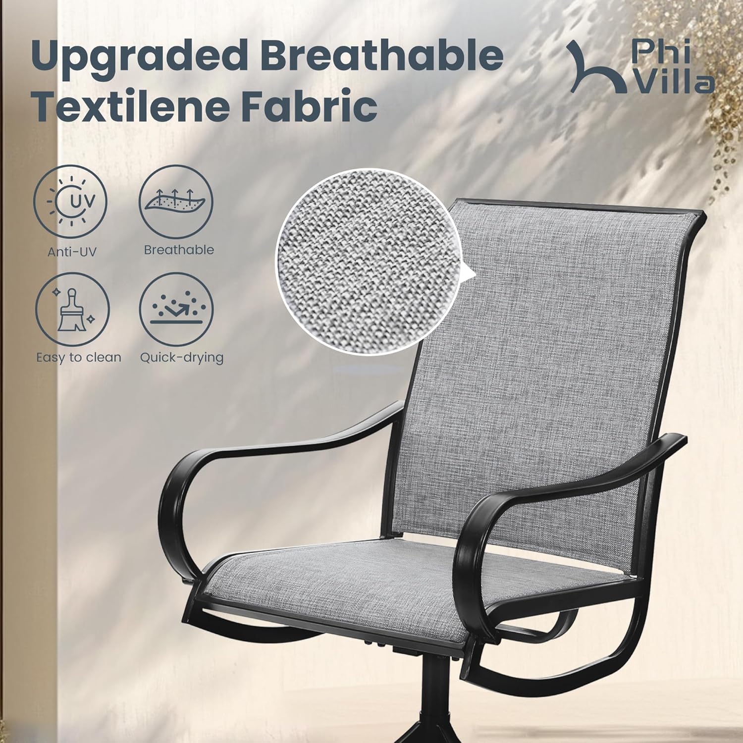 - Premium Textilene Seat and Back: The chair seat and back use high density textilene mesh fabric mixed with olefin which not only comfortable but breathable, easy-to clean and long-lasting for all weather