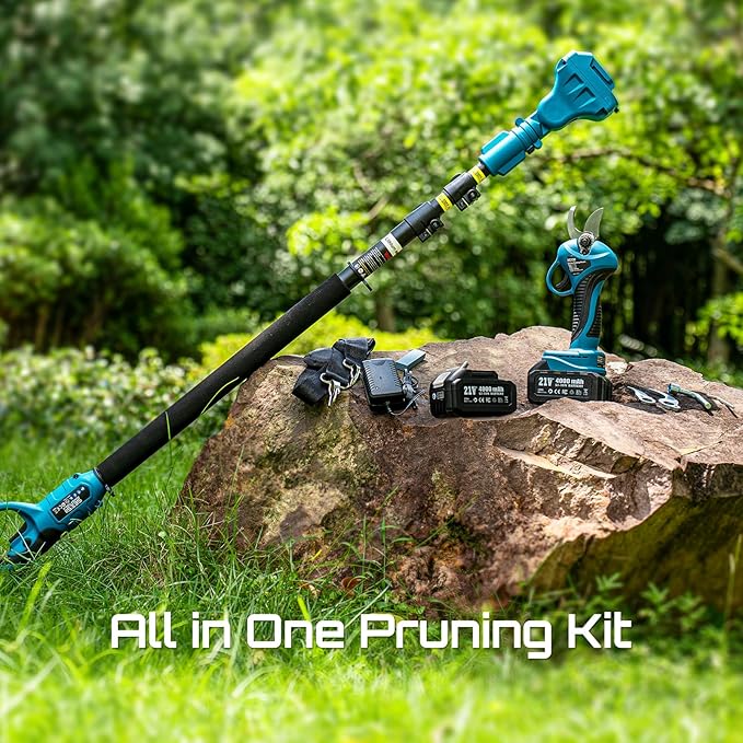 - 【2-in-1 Electric Pruner with Extended Reach】Switch between handheld and pole modes to trim branches at any height. Extends from 4.9 to 9 FT (up to 15 FT reach), allowing safe pruning of high branches from the ground—no ladder needed for faster, easier tree pruning