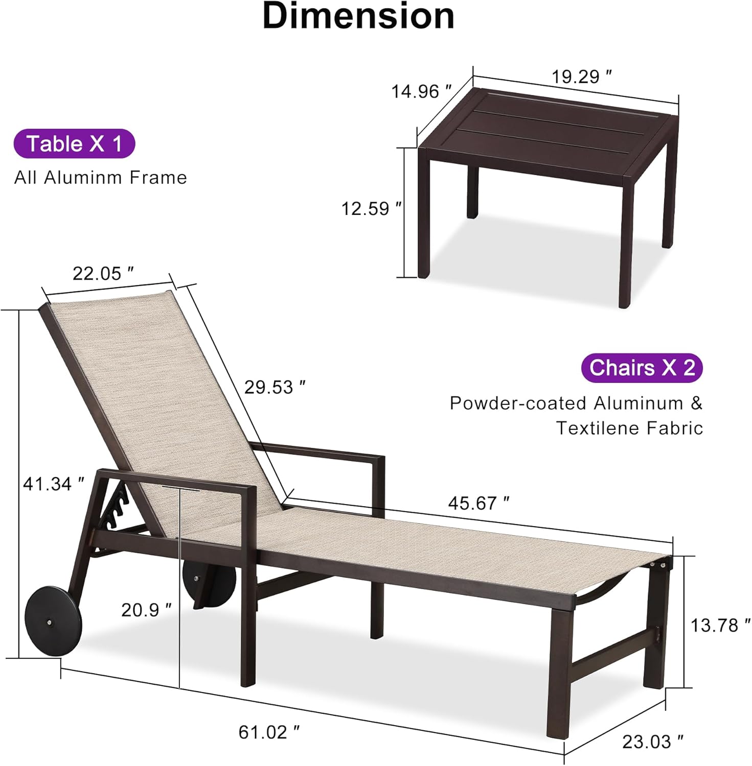 - STURDY FRAME: Rugged powder-coated aluminum frame, the patio chaise lounges are rust-proof and durable. Besides, the backrest has a triangular structure that can hold up to 330 pounds, providing you with reliable support.