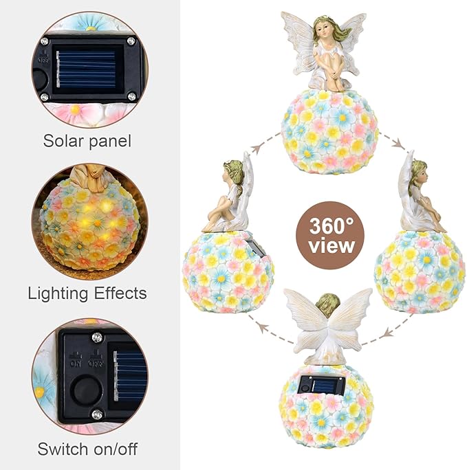 - 【AUTO-ON SOLAR DECORATION】This solar flower fairy figurine is very easy to install and use. Simply turn on the switch and place it under the sunlight and let the solar panel will charge within 5-8 hours during the day and light up automatically at night for 6-8 hours.Note: This Flower Fairy is solar charged