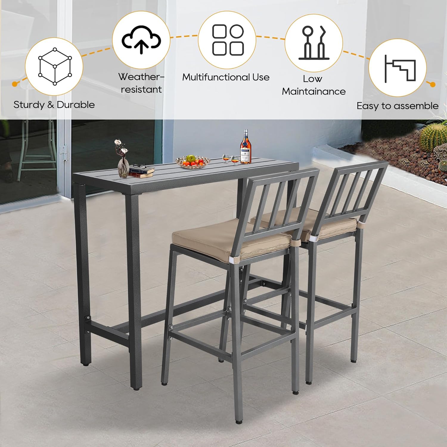 - Built to Last: Our patio pub set is made of reinforced metal frame, which is sturdy and durable for long time use. Besides, the powder coating makes the high dining bistro set weather-resistant, waterproof, and fade resistant, which is a great choice for indoor and outdoor use
