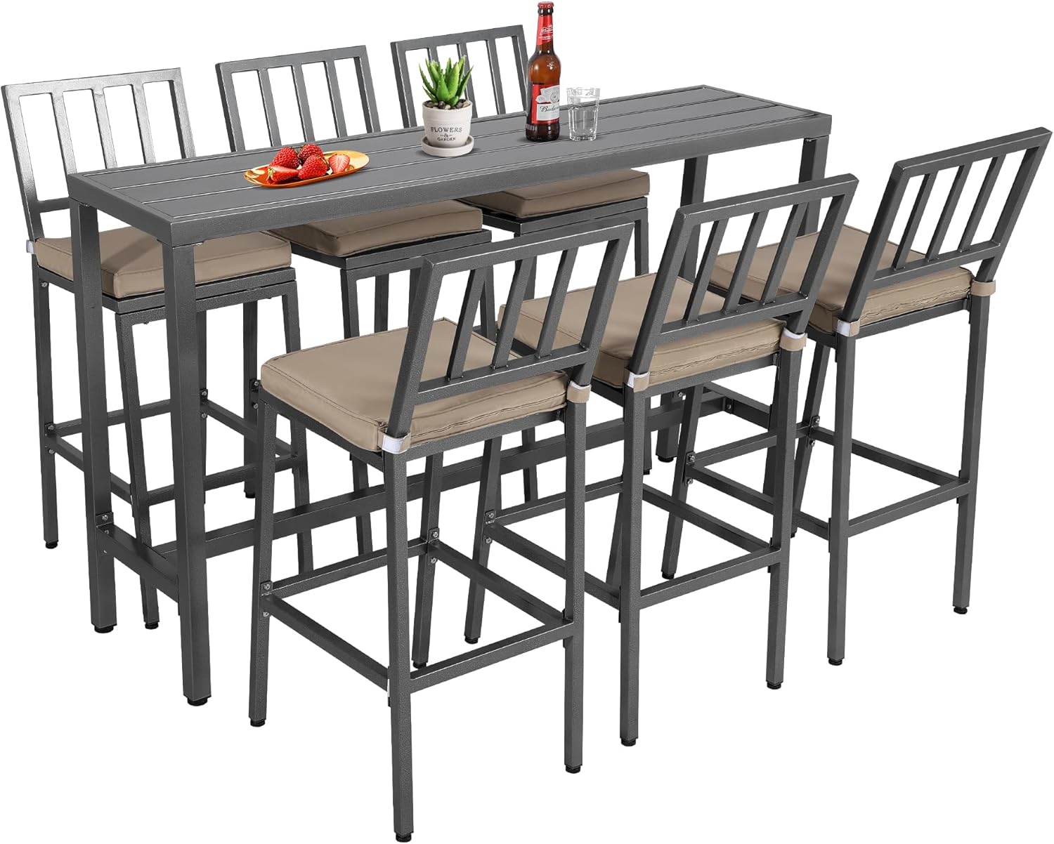 - Space-Saving Design: The bar height patio dining set is ideal for small space, and can be placed for corner. When the bistro bar set is not in use, the 6 bar stools could slide under the table, which could save your space