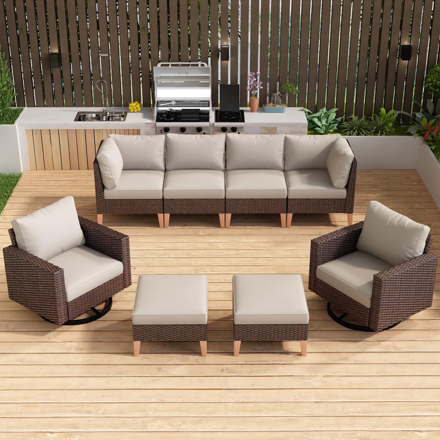 HUMMUH 8 Pieces Patio Furniture,Outdoor Modular Sectional Couch Swivel Rocking Chairs with Ottomans,All Weather PE Wicker Patio Conversation Sets for Garden Porch Backyard