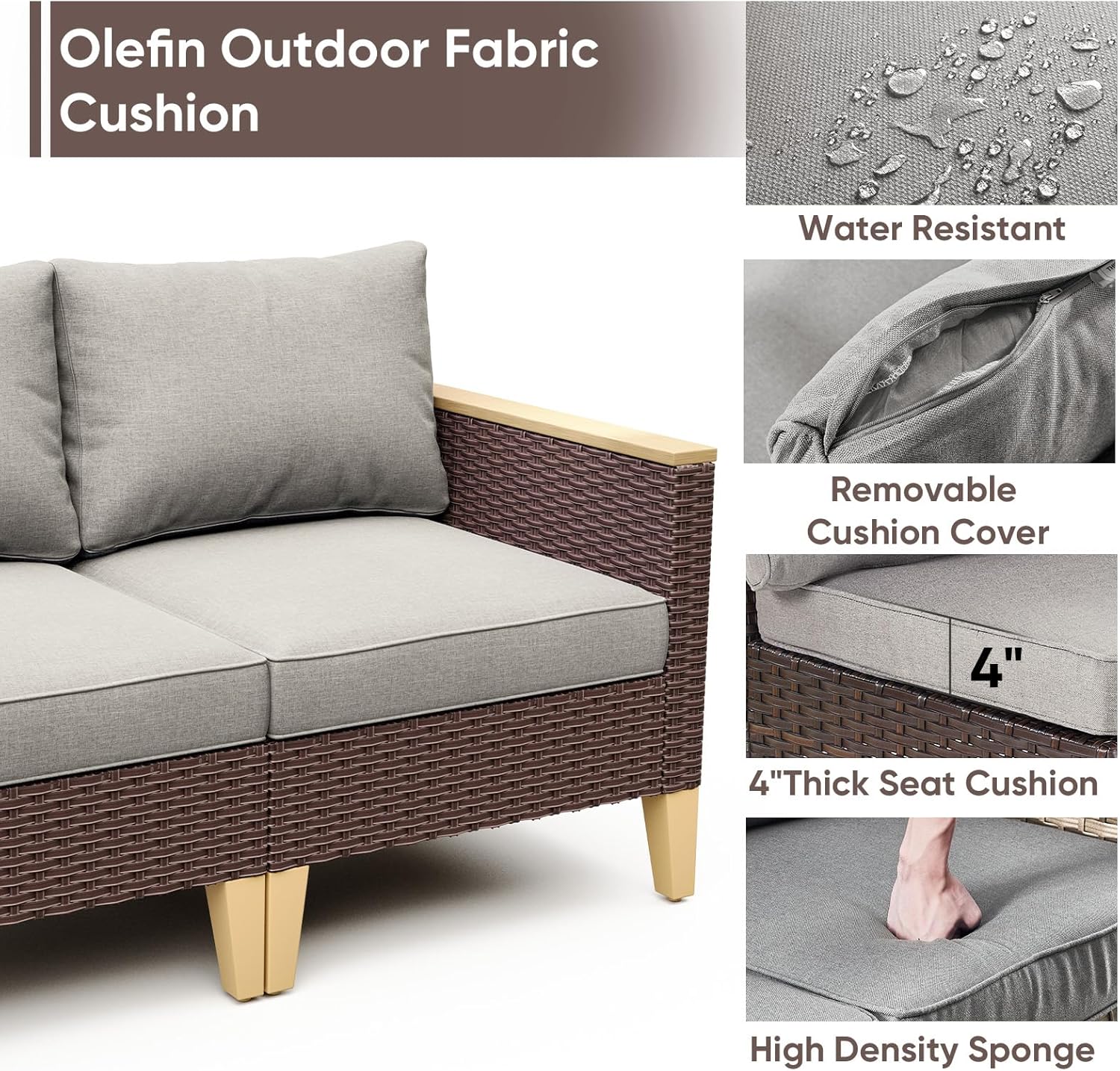 - Comfort Thick Cushions:Our cushions are made of high-quality olefin fabrics that provide excellent UV protection and water repellent function,Filled with a high-density 4" sponge to stay fluffy and non-deformation,Provide soft and comfortable seating experience, removable cover design is easy to clean.