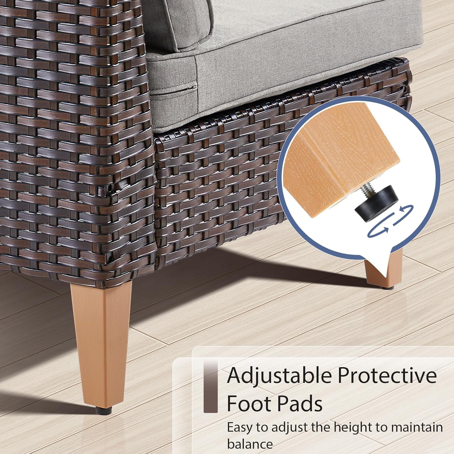 - Durable Sturdy Construction:All made with anti-rust powder-coated metal frame and high-quality Handwoven PE wicker which makes this patio furniture set resistant to UV and all weather,The upgrated trapezoidal feet provides strong support,with the non-slip plug, it will help you to avoid scratches on the floor when you move the furniture around.