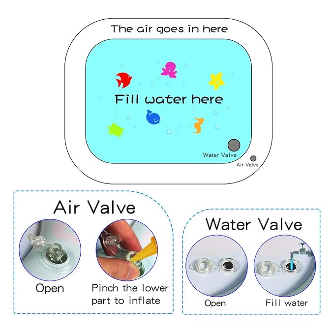 - 【Baby Water Mat and Safe】: The baby water play mat is made of BPA-free PVC materials that has been thoroughly tested, proved tummy water mat is comfortable soft, inflatable.