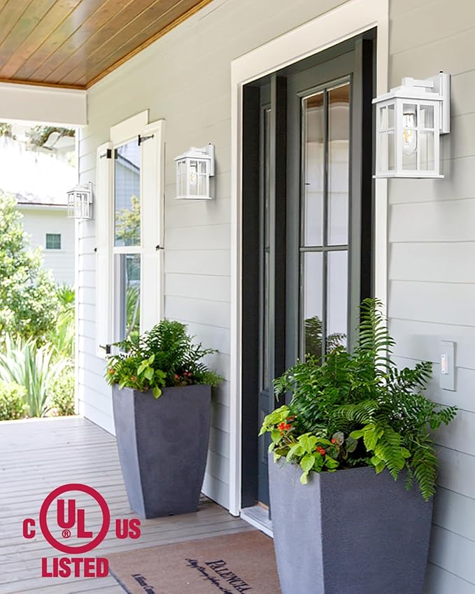 - 👍【High-Quality Construction & Tempered Glass】Our outside lights for house feature a sturdy die-cast Aluminum frame with a white matte finish, ensuring superior craftsmanship. These waterproof, anti-rustic, and weather-resistant wall sconces are built to last. Unlike fragile glass panels, our outdoor wall lights for house are equipped with high-tempered seeded bubble glass that is strong and durable. The seeded bubble glass enhances the light, creating a warm and inviting atmosphere in your house.