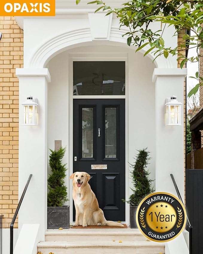 White Outdoor Wall Lights, Motion Sensor Porch Light Outdoor, Dusk to Dawn Outdoor Light Fixtures, Waterproof Outside Lights for House, Garden, Front Porch, Tempered Glass, Anti-Rust