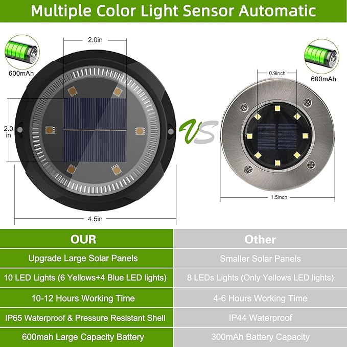 - 【More Beautiful 10 LED Bulbs】 GREPRO solar ground light is designed with 6 LED warm white lights, 4 LED side blue lights and circular aperture to make the light atmosphere brighter and more beautiful. The warm white and blue lights come with a relaxing, romantic and carnival atmosphere. It is the best decoration for garden, pool, trail and other outdoor places.