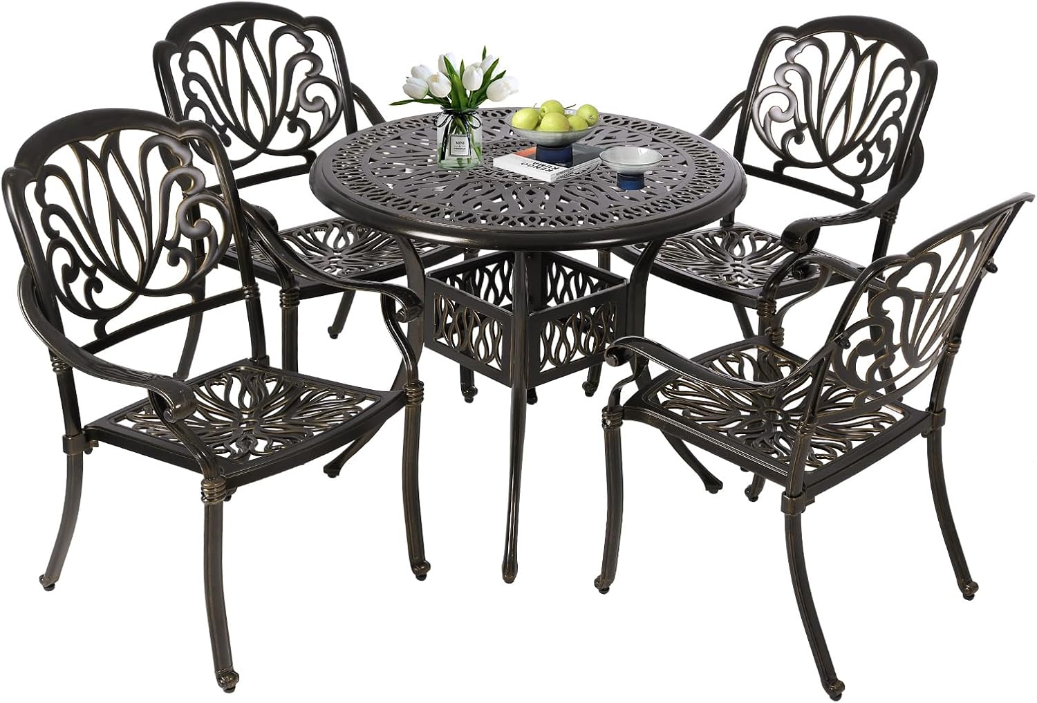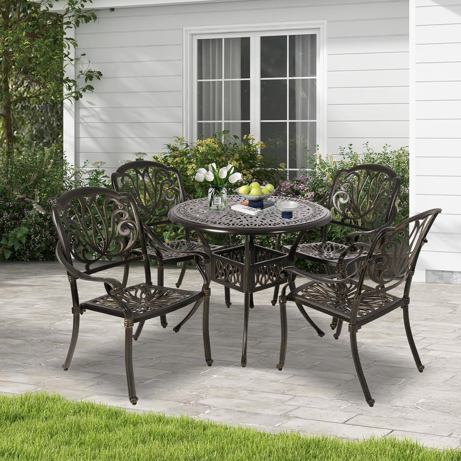 - 5-Piece Patio Dining Set: Our cast aluminum patio furniture set includes 4 chairs and 1 round outdoor dining table. This outdoor dining set has an antique bronze finish with beautiful lattice-weave and flower design, which is not only classic but also elegant. This will be the perfect addition to your outdoor space
