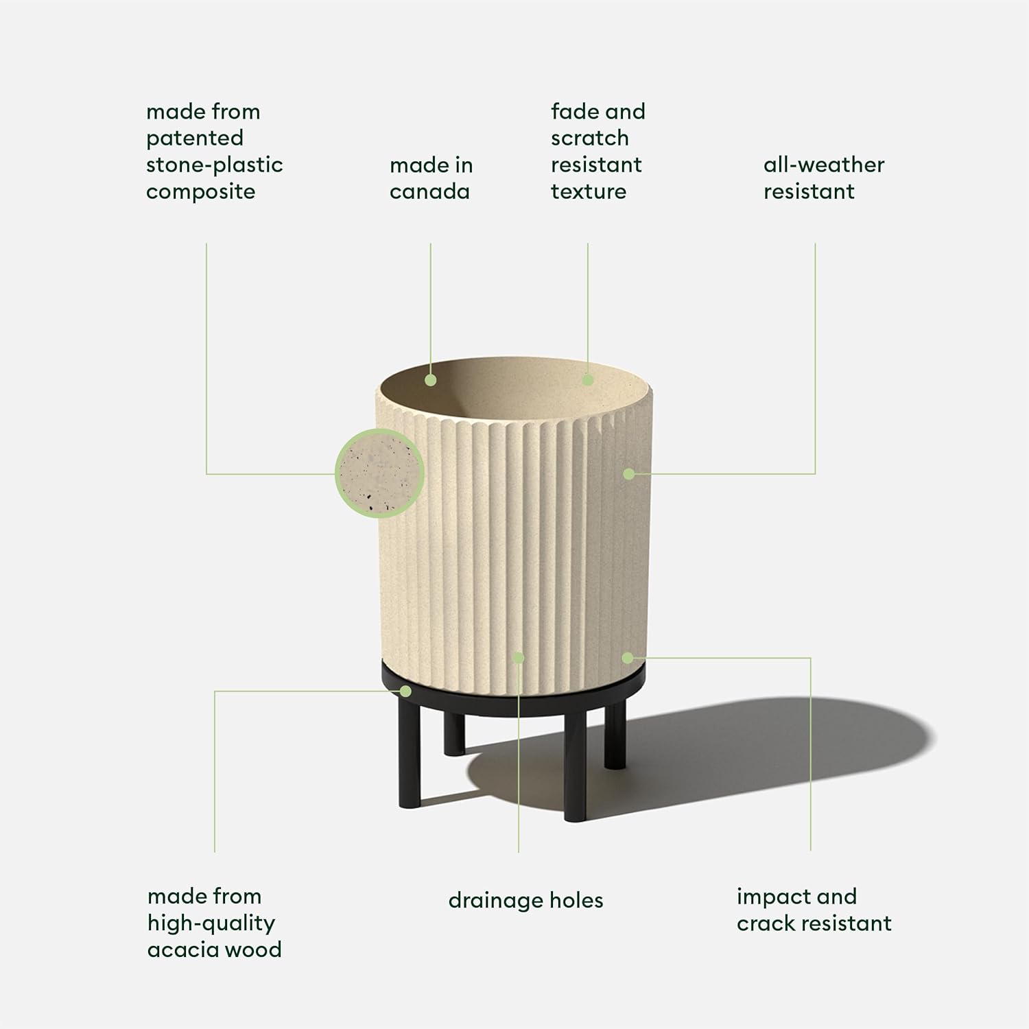 - DURABLE MATERIAL: Made from a patented plastic-stone composite, this fluted planter has a subtle textured finish and is all-weather resistant to cracks, scratches, UV and fading; perfect for hot or cold climates ranging from -20 to +120 degrees