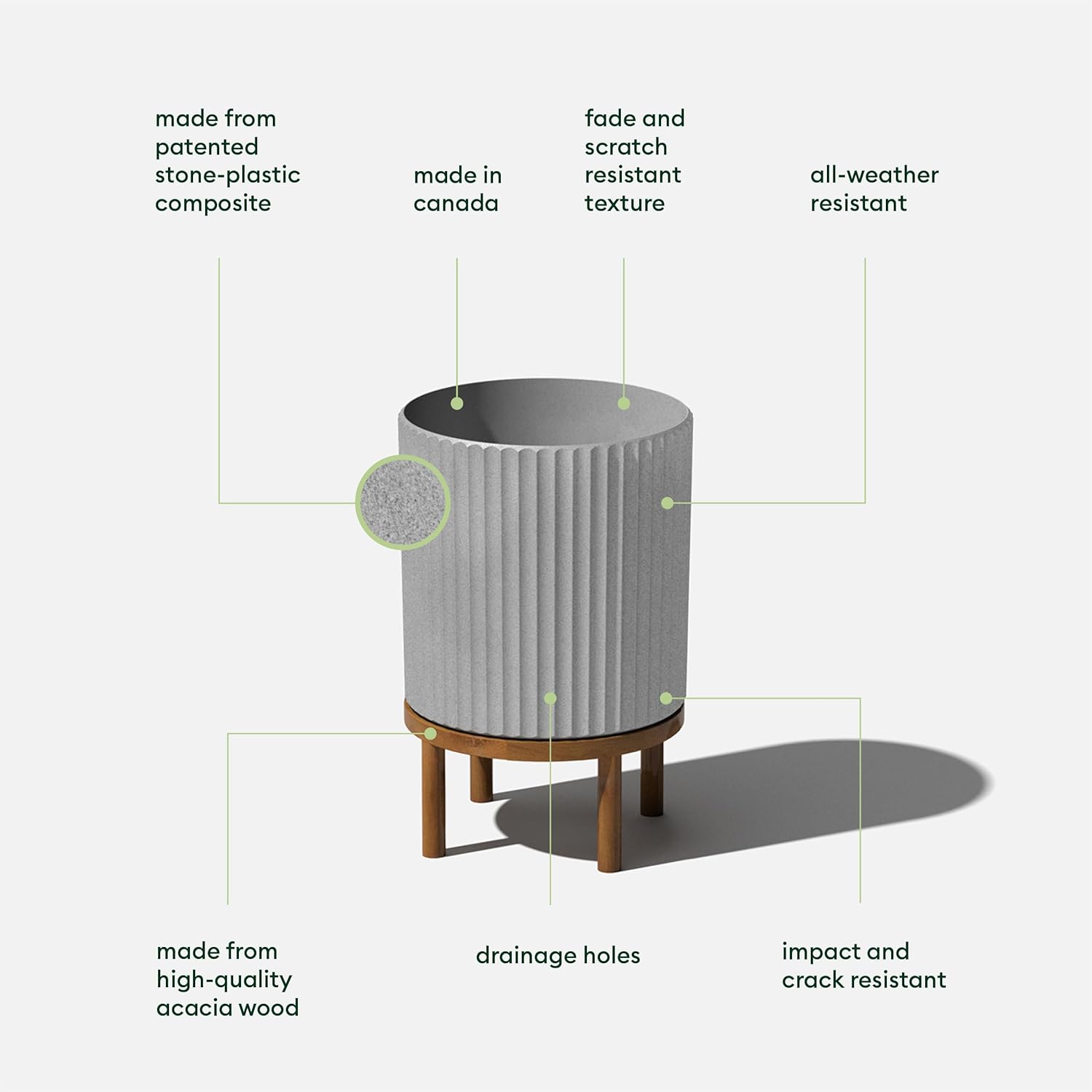 - Material : Plastic-stone composite planter & Acaia wood stand