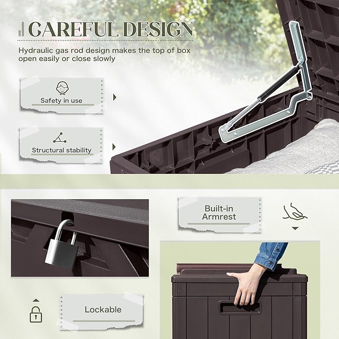 - EXTRA CUSHION:Besides helping you to organize your space, the deck box is equipped with a removable thick cushion, you can also use it as a stool to ensure your safety when opening and closing the box.