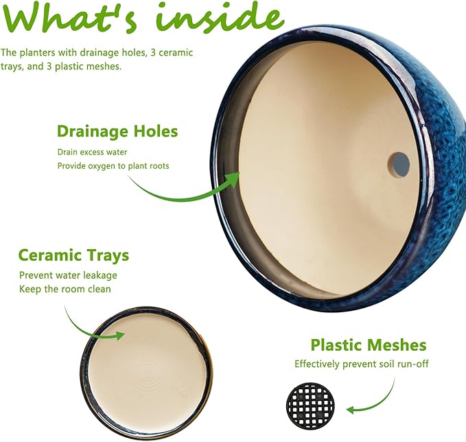 - Drainage Holes and Accessories: Each ceramic planter pot has a drainage hole at the bottom, a mesh and a ceramic tray for collecting water. This will provide ample oxygen to the plants, prevent root rot, as well as keep the room clean.