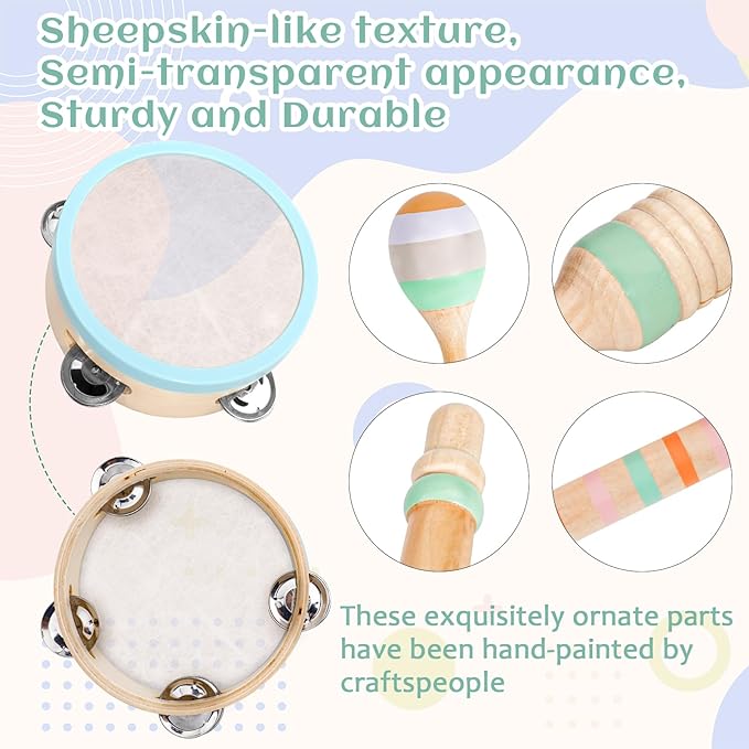 - âšăExquisite CraftsmanshipăThe drum surface of the tambourine is crafted from imitation sheepskin, offering a semi-transparent appearance and a realistic texture, ensuring durability and resilience. The clarinet, wood sounder, hand bell, and two maracas are adorned with intricate hand-painted designs. This meticulous hand-painting process not only requires considerable time and effort but also results in stunning, individualized pieces, each displaying unique beauty and charm.
