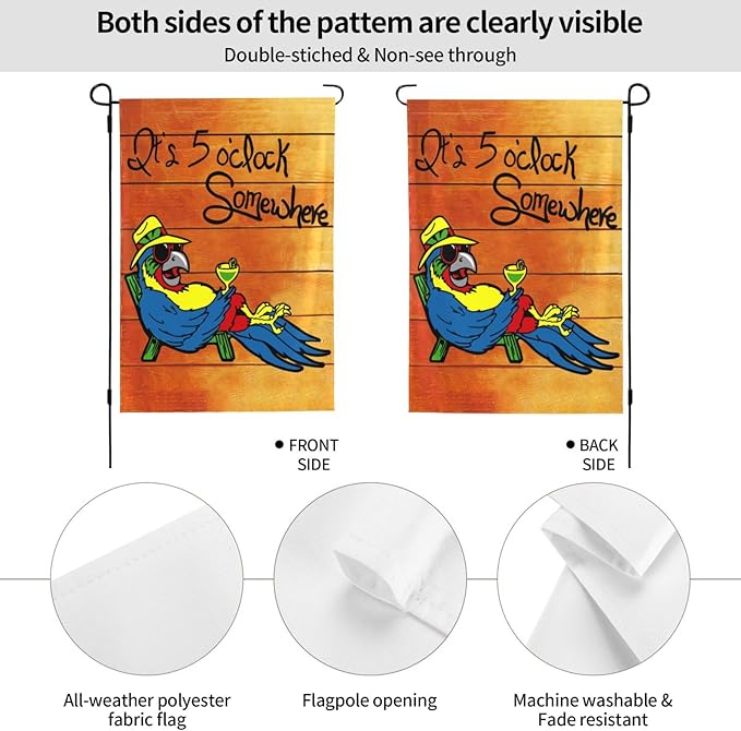 - Material: This 5 Oclock Somwhere Garden Flag Is Made Of Polyester, Ensuring Its Durability And Lightweight Design.The Designs And Words Are Double Sided Which Can Be Clearly Viewed From Both Sides.