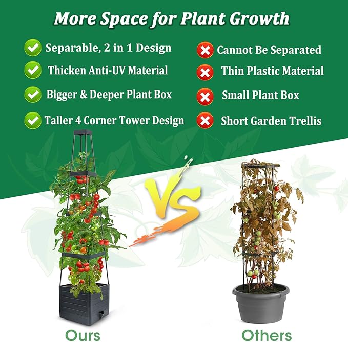 - Automatic Watering System : There is a water reservoir at the bottom of the tomato planter box. It automatically eliminates excess moisture. Maintaining moist and healthy soil and plant respiration reduces the time cost of maintenance and care. Meanwhile, this raised garden bed is super easy to assemble, No tools or skills required, just minutes.