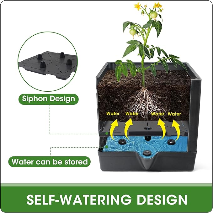 - SELF-WATERING SYSTEM: Self watering tomato planter with trellis has a built-in reservoir that ensures the plants receive consistent hydration. The bottom grid design utilizes the siphon effect, allowing the roots to pump water efficiently, minimizing the risk of under-draining or over-draining. There is a water injection port on the side, and the right amount of water is poured into the sowing box, without daily watering.