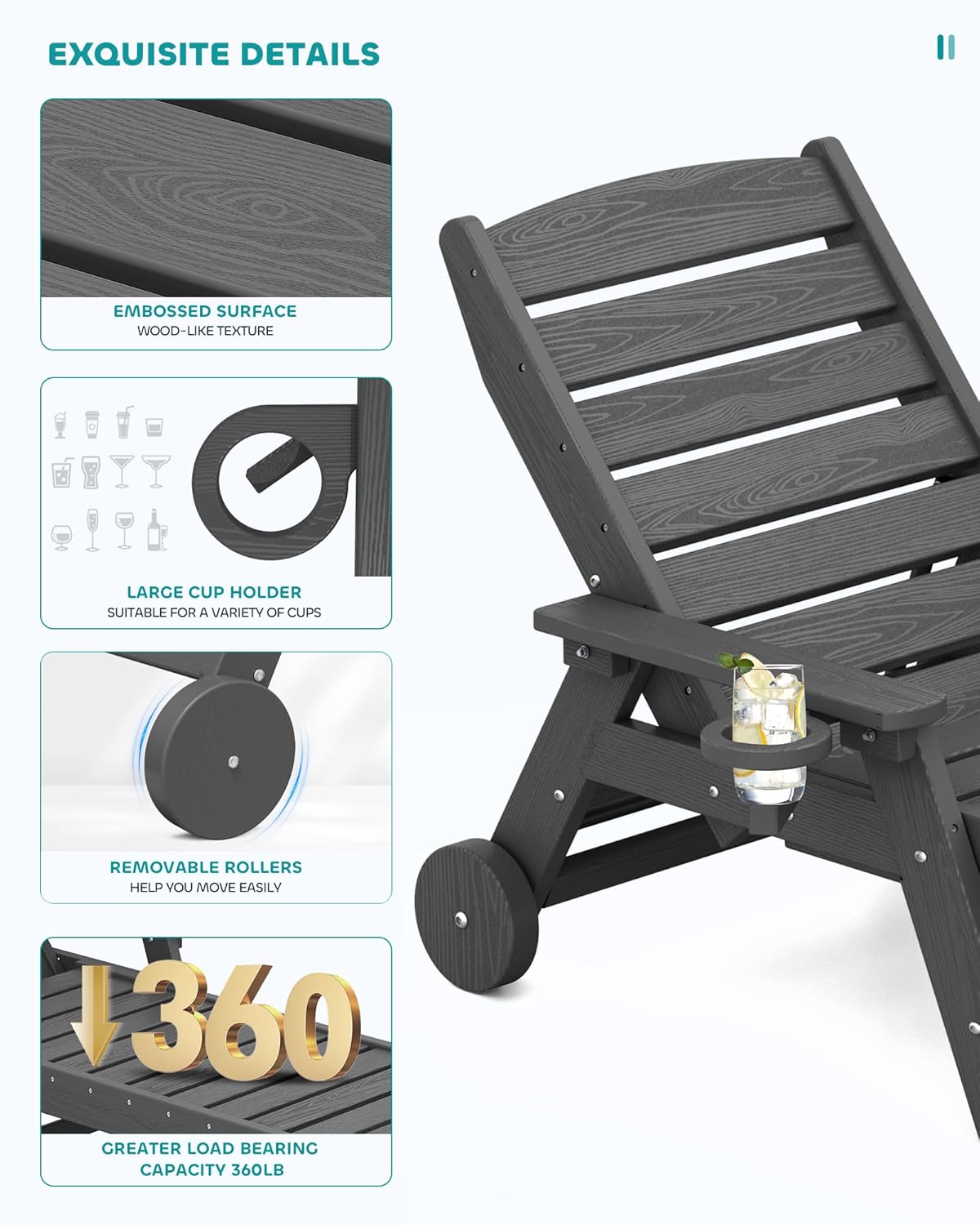 - Modern Stylish: Our HDPE adjustable patio lounge chair with wheels is available in a variety of colors, allowing you to choose one that complements your outdoor decor. Its modern design adds both comfort and practicality to any outdoor space.