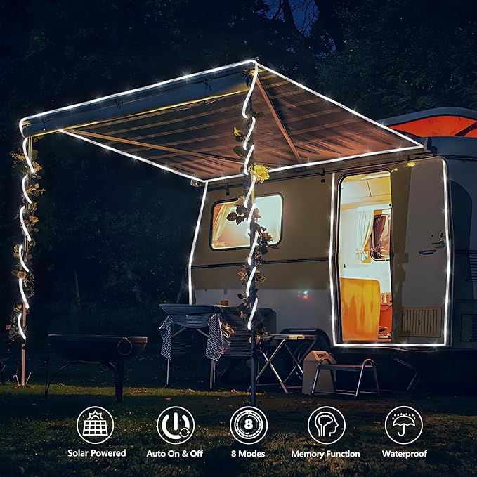 - Auto On/Off & Solar Powered Rope Lights: This solar patio lights is powered by solar energy, energy saving, no extra utility electric cost, and no need to replace the battery. Just turn on the switch and put the solar string lights under the sunlight, built-in solar panel absorbs sunlight to recharge during the day, and the camping lights will turn on auto at night. It takes 6-8 hours to fully charge and work up to 12-15 hours. Note: Do not place the panel where there is a light source at night.