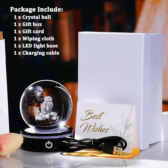 - Gift Box Packaging: The packaging includes a crystal ball, LED base, USB cable, gift box, gift card, and wiping cloth. Crystal night light creates a comfortable light, suitable for placing on table, bedside table, dining table, party, cafe etc.