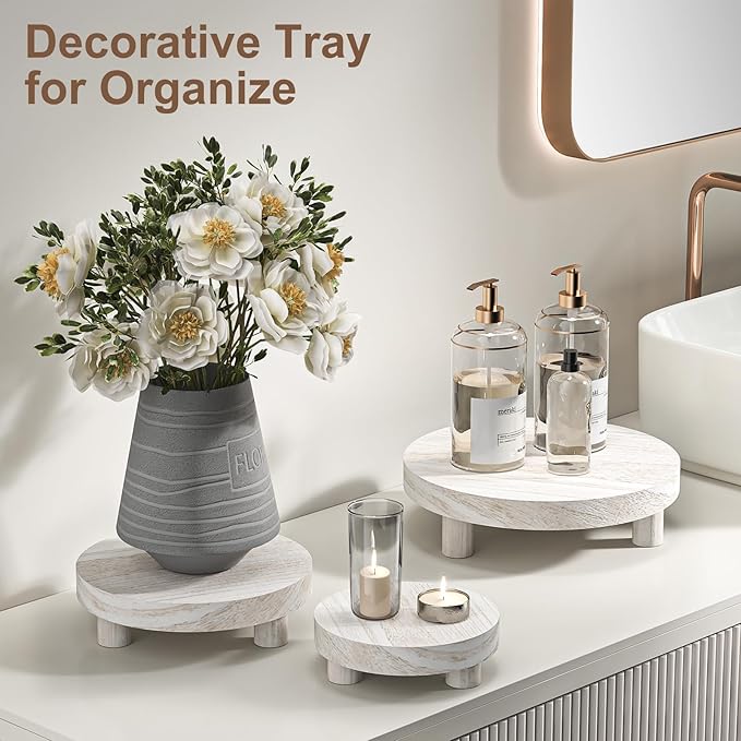 - What You Receive: You will receive three different diameters (6", 8", 10") of round trays and 3 different heights (0.98"", 1.38"", 1.77"")of the feet, which provide endless DIY possibilities. This wooden plant stand can be stacked, stand alone or remove feet for an easy tray display. Easy assembly, just screw into the pre-drilled holes then a beautiful display stand is assembled.