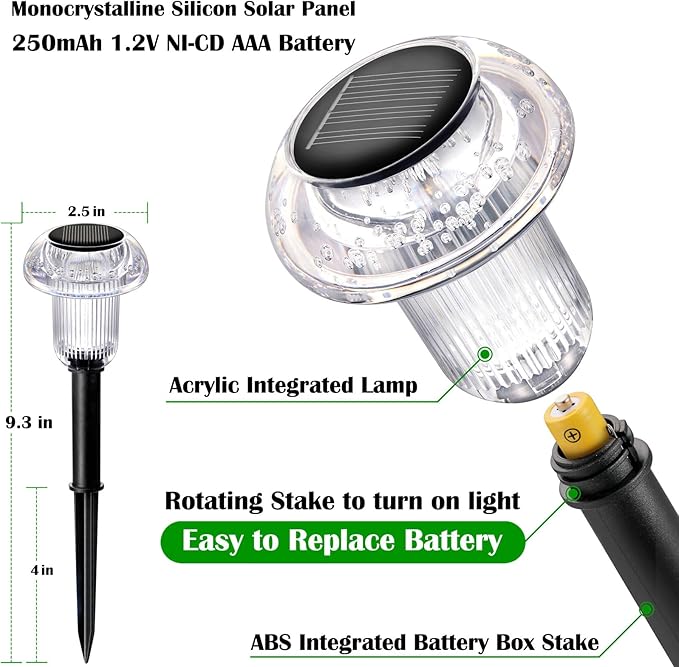 - HIGH EFFECT: Solar pathway lights outdoor adopts monocrystalline silicon solar panel and contains 1.2 V 250 mAh Ni CD AAA Battery. They automatically charge during the day, over a period of 4-6 hours. Then, they turn on automatically at night, providing at 6-8 Hours of lighting.