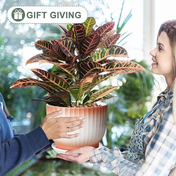 8 Inch Plant Pot, Ceramic Planter with Drainage and Saucer, Ceramic Pots for Plants, Indoor Plant pots,Ceramic Flower pots(Orange+ White, Plants NOT Included)
