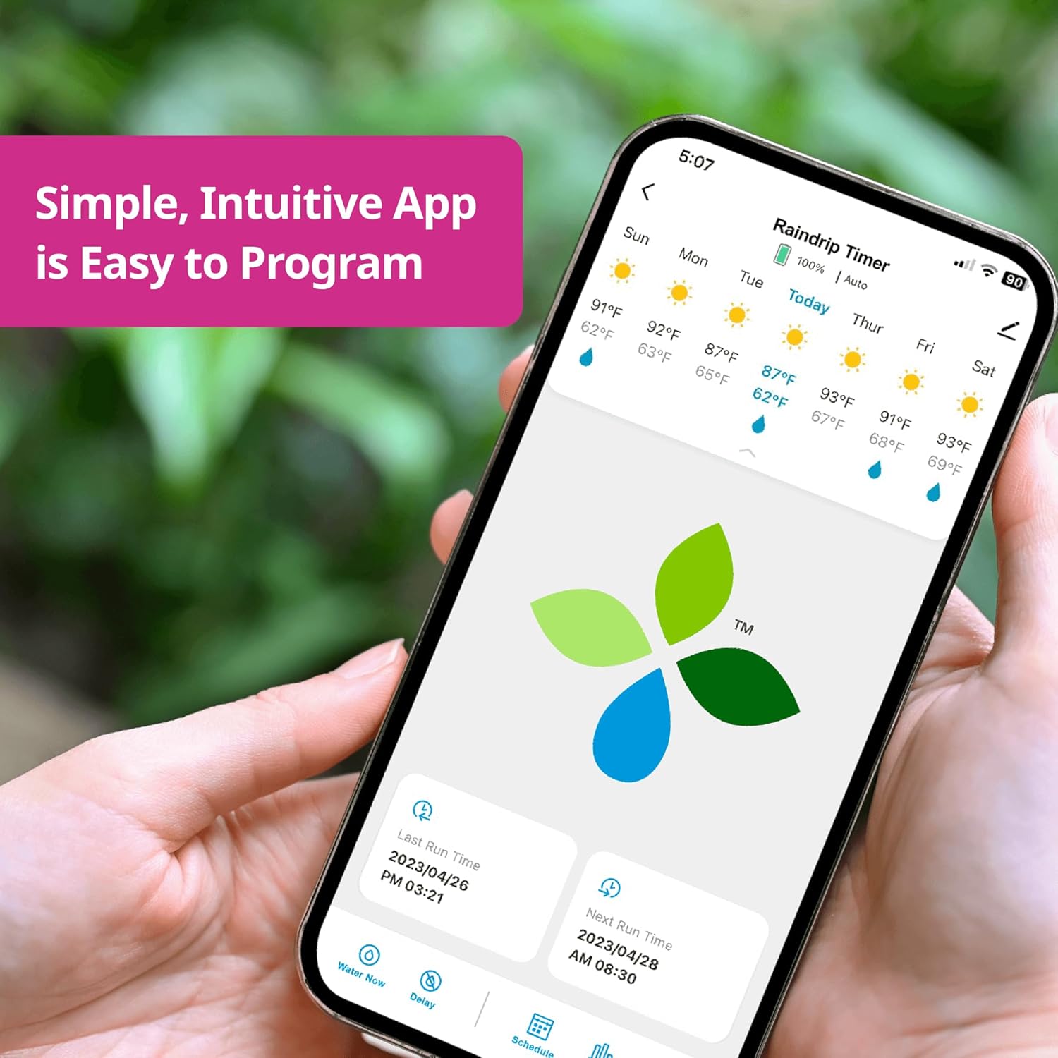 - CONTROL FROM SMART PHONE OR TABLET: Programming is simple with the easy-to-use interface on the free Raindrip App where you can automate your drip system anytime, anywhere; includes a manual control button that physically starts/stops water flow