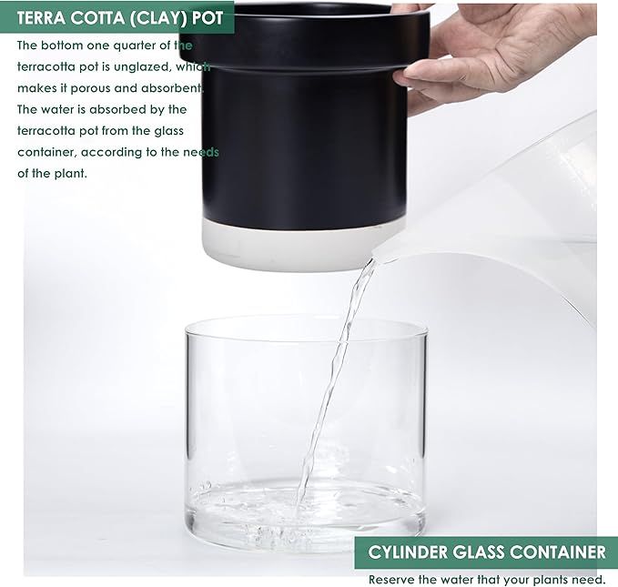 - Self-Watering System: The bottom quarter of the terracotta pot is unglazed, with a glass reservoir that allows plants to absorb just the right amount of water through the pot walls.