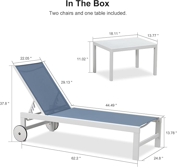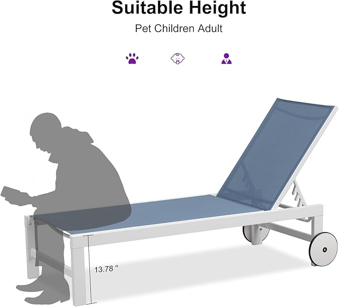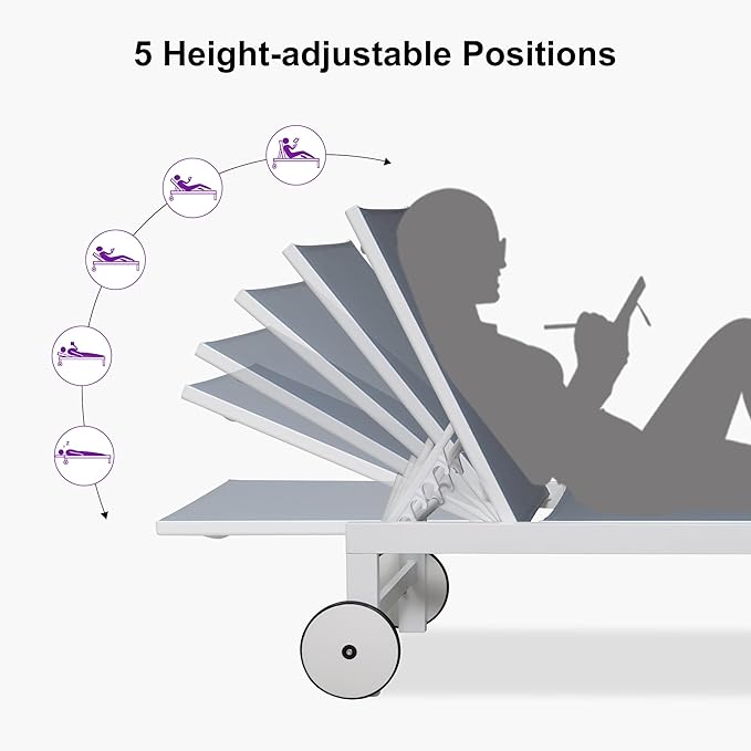 - White Aluminum Frame: The white chaise lounge offers superior sun protection; reducing heat absorption and maintaining a comfortable touch in any weather conditions; Additionally, it provides sturdy support with a maximum weight capacity of 270 pounds