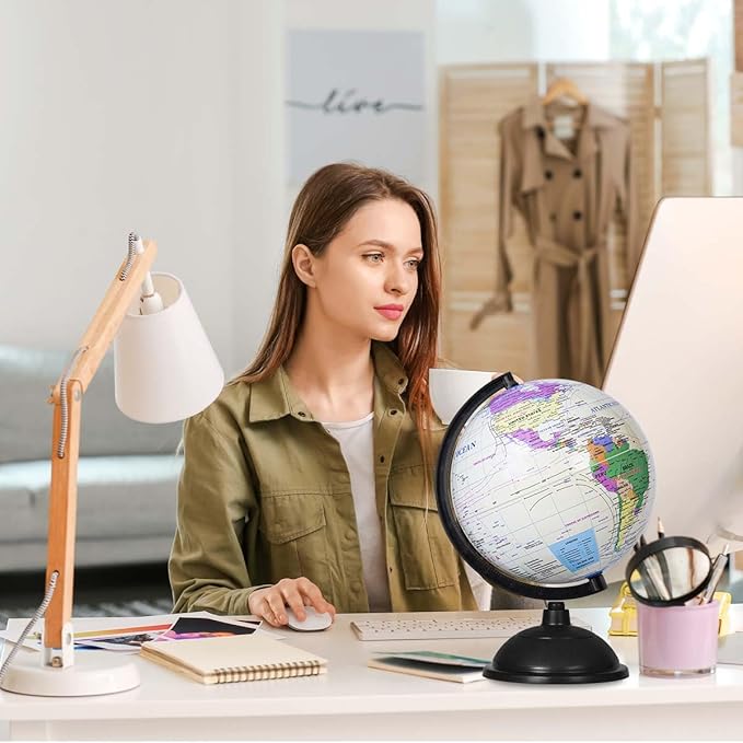 8 Inch World Globe with Stand Rotating Earth Spinning Globe for Kids Geography Classroom Education or Decorations (White)