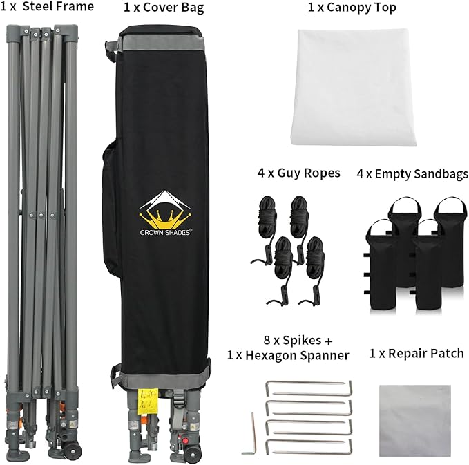 - HIGH GRADE STEEL FRAME - The durable, high-grade, corrosion-resistant steel truss frame with hardened through bolts comes pre-assembled and can be set up without any tools. Engineered to support up to 120 lbs. distributed across the frame, it ensures robust and reliable performance. The extended ceiling assembly and upgraded high peak design make it easier for rainwater to run off, preventing water pooling on the canopy. Perfect for extended outdoor use at markets, festivals, and exhibitions