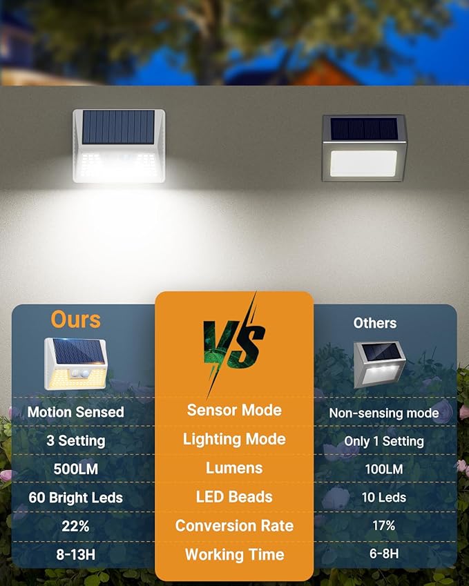 - 【Faster Charging-Longer Illumination】:This solar motion activated light boasts a supercharged solar panel with a 20-22% conversion rate, meaning it charges up quicker during the day. That translates to longer illumination at night, keeping your outdoor space brightly lit for enhanced safety and security