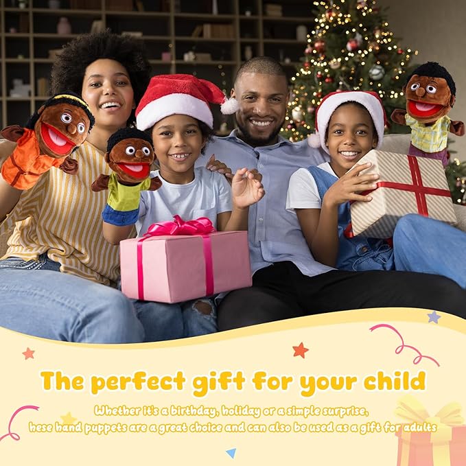 - A Fun Stuffed Animal Play - The 6 pcs african American family puppet is about 12 inch in length, 6 members choose one, the large size allows the hand puppet to move easily and to see movements and expressions even from a distance