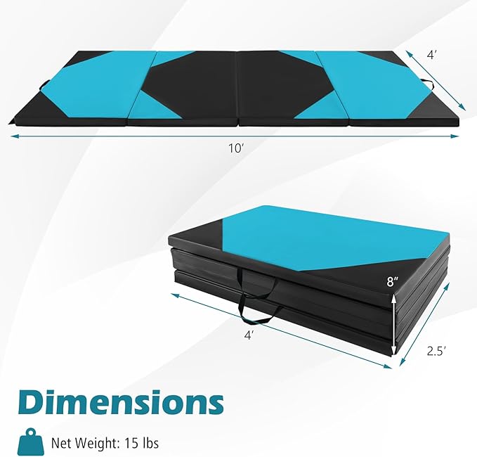 - [Foldable Design with Carry Handle]: Maximize your space with the easy-to-fold design of this aerobics mat. It effortlessly transforms from a spacious 4' x 10' exercise platform to a compact, portable unit with a convenient carrying handle, ensuring hassle-free storage and transport.