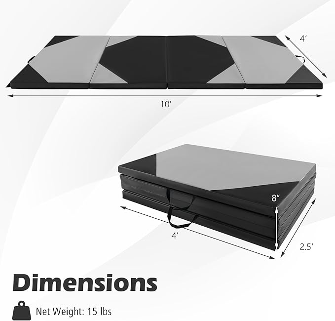 - [Foldable Design with Carry Handle]: Maximize your space with the easy-to-fold design of this aerobics mat. It effortlessly transforms from a spacious 4' x 10' exercise platform to a compact, portable unit with a convenient carrying handle, ensuring hassle-free storage and transport.