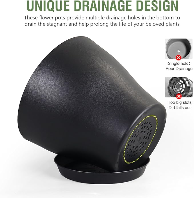 - 【Drainage Holes and Trays】Each plant pot features well-designed drainage holes at the bottom to ensure proper water flow. Additionally, saucers catch excess water, keeping your growing area clean and tidy while also ensuring that your plants remain hydrated without becoming waterlogged.