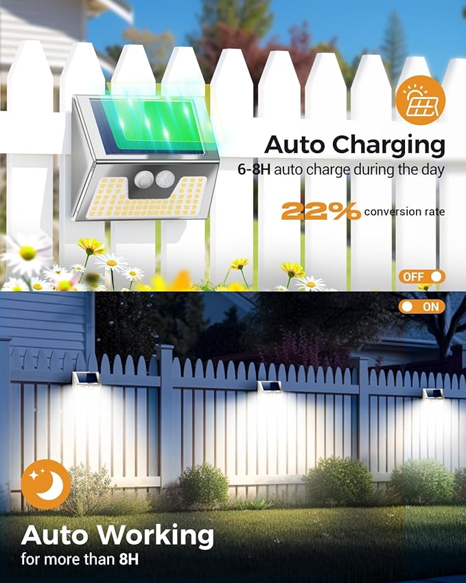 - Faster Charging-Longer Illumination:This solar motion activated light boasts a supercharged solar panel with a 20-22% conversion rate, meaning it charges up quicker during the day. That translates to longer illumination at night, keeping your outdoor space brightly lit for enhanced safety and security