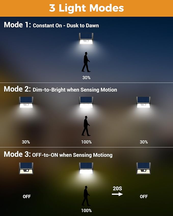- Smart PIR Motion Inductor: vighep solar lights outdoor offer 3 lighting modes for versatile functionality. 1. Motion Sensor Mode: Lights turn on when people approach, ensuring safety and convenience. 2. Permanent On Mode: Lights stay illuminated all night for continuous visibility. 3. Smart Brightness Control: Lights stay on all night and automatically brighten when motion is detected, optimizing energy efficiency and enhancing security.