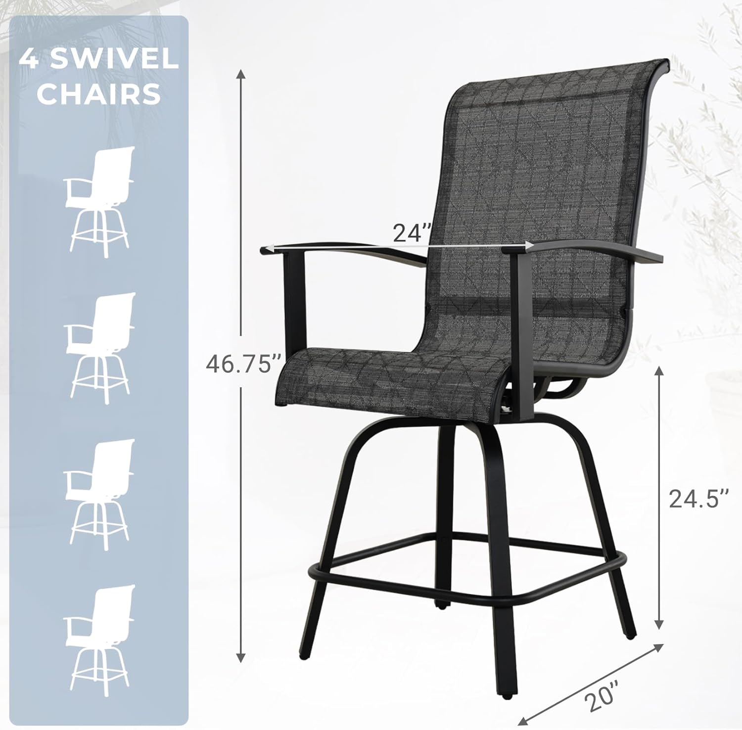 - Robust Construction: This 5-piece counter height patio bar set combines stylish looks and stable construction! The tabletop slats with faux wood grain vary in width, and the rust-resistant coating of the slats brings convenience for daily maintenance. The high bar table features three layers of ultra-stable construction for added stability while you can also relax your feet on the crossbar at the bottom of the table