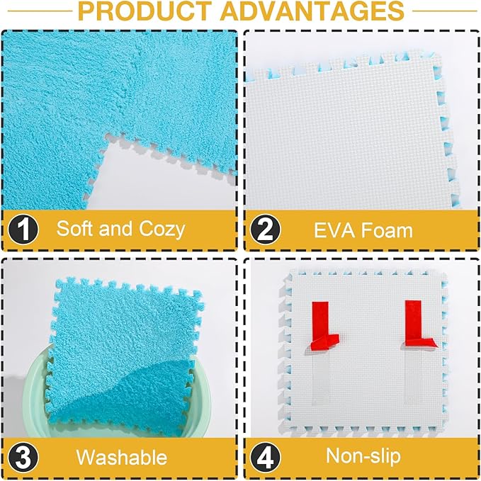- EASY TO ASSEMBLE: Our plush foam floor riser saw matches perfectly, so you can easily assemble fuzzy interlocking foam floor tiles to create a piece of customized area of your own, simple and easy to dismantle and storage.Additionally,Unlike EVA carpets, they can provide warmth even in cold air-conditioned rooms, ensuring that your children play in a comfortable environment