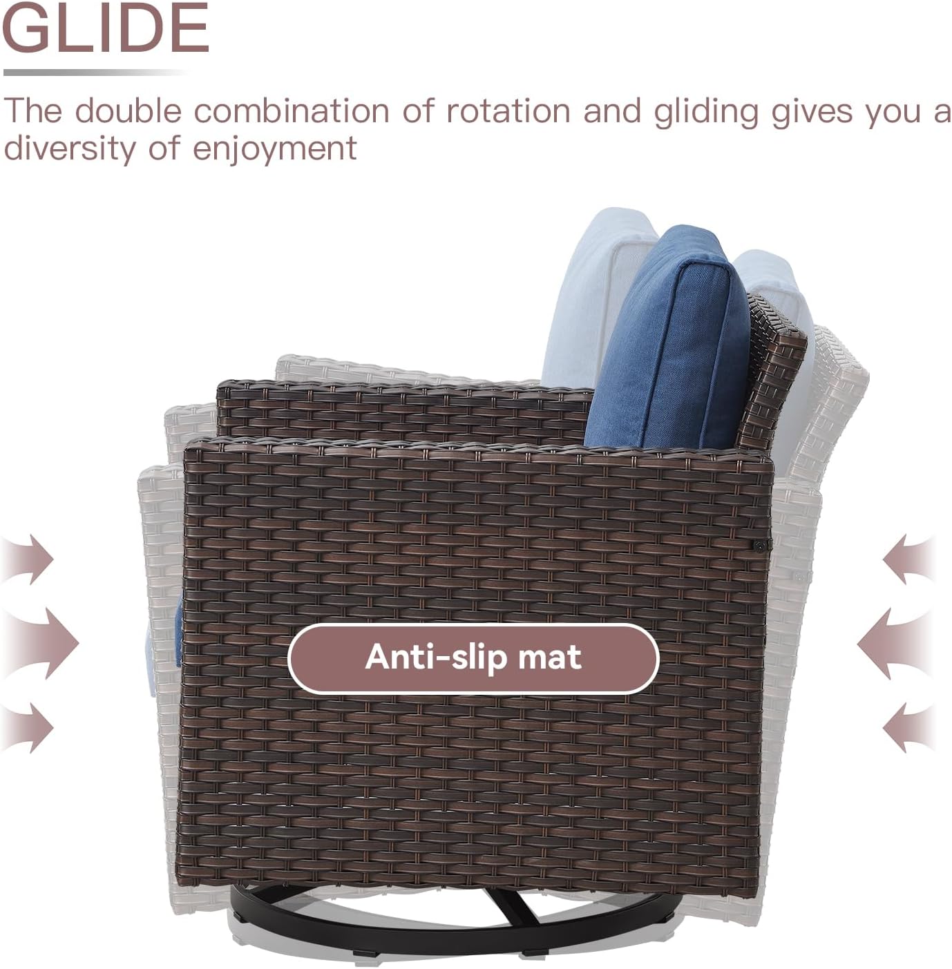 - 360°Swivel Glider Rocker Chairs: Design of rotating 360 degree,swinging back and forth,You can easily turn your face away from the sun without moving the entire chair, or swing your seat like a cradle for the ultimate relaxation while listening to music or watching your children play outside.