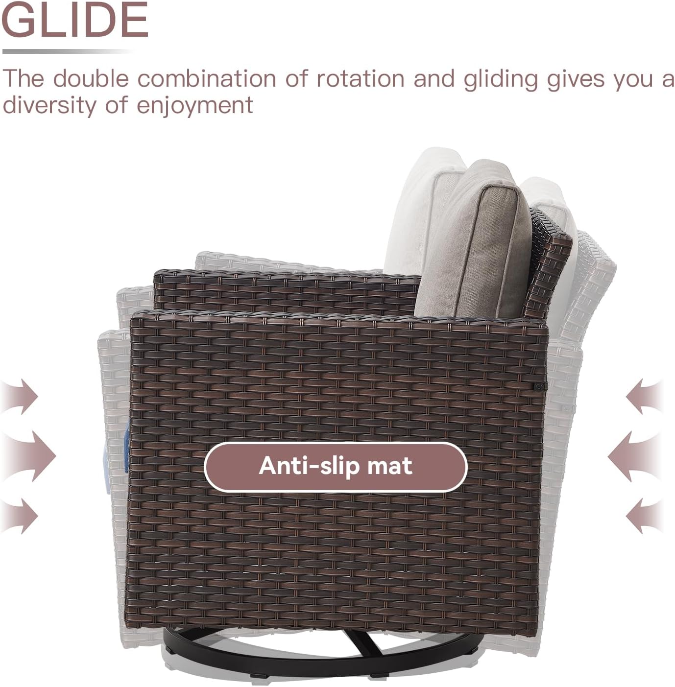 - 360°Swivel Glider Rocker Chairs: Design of rotating 360 degree,swinging back and forth,You can easily turn your face away from the sun without moving the entire chair, or swing your seat like a cradle for the ultimate relaxation while listening to music or watching your children play outside.